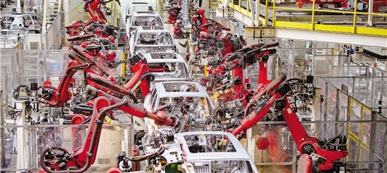 图为金华市新能源汽车小镇零跑汽车智能工厂车间里,智能化生产线繁忙有序运转(资料照片)。 拍友 胡肖飞 摄