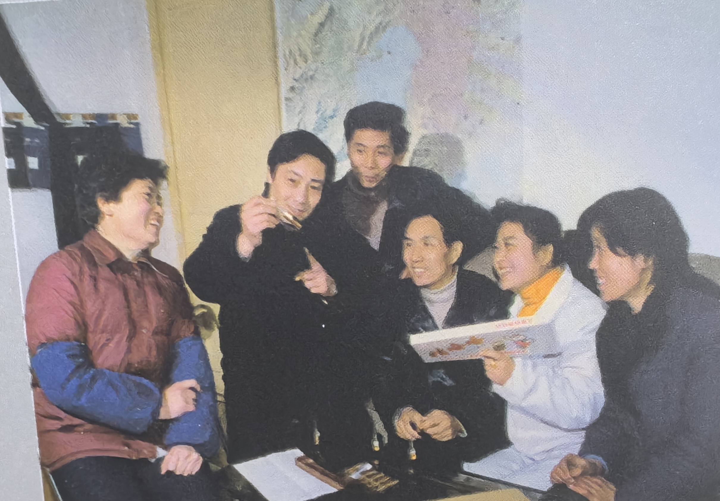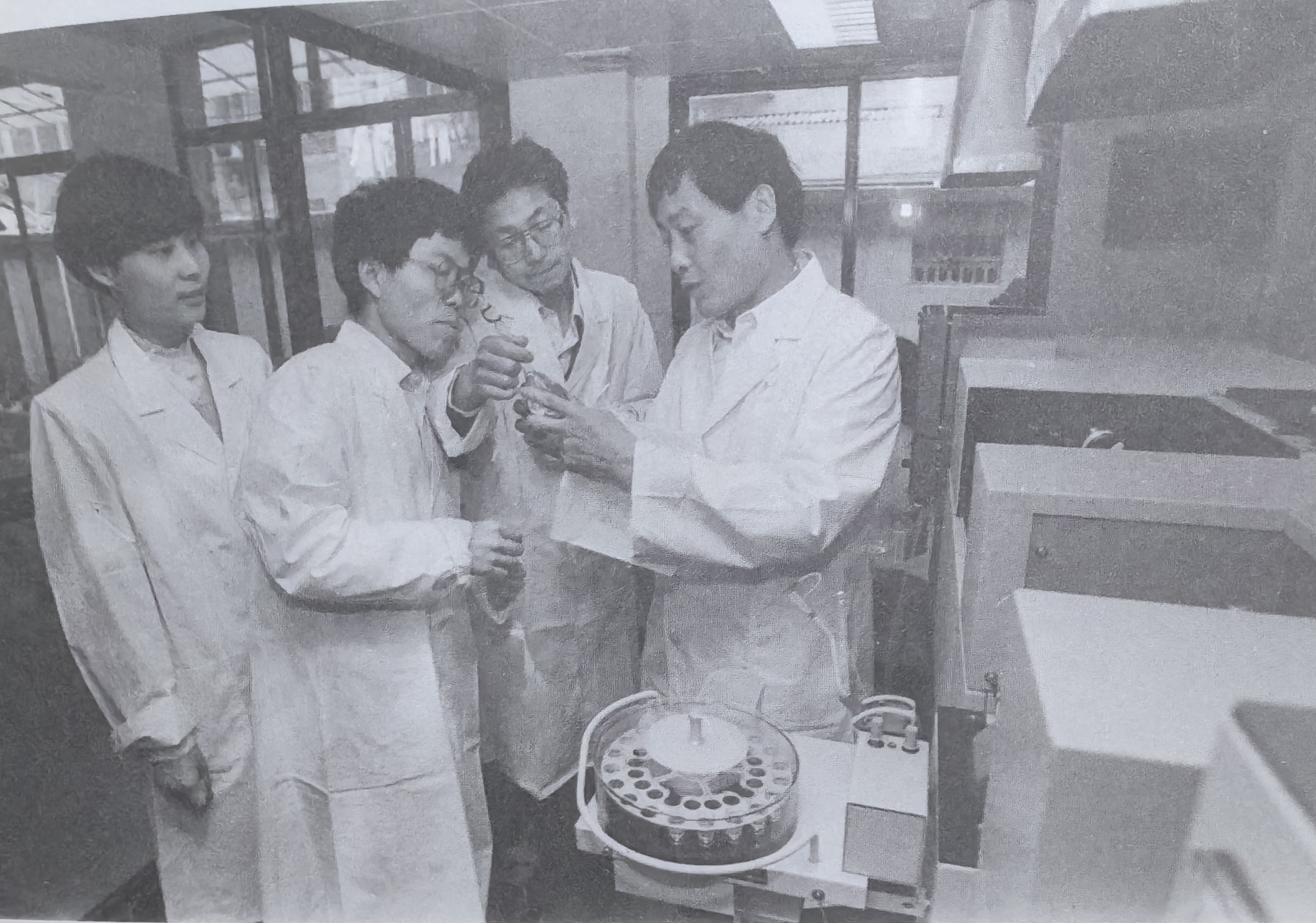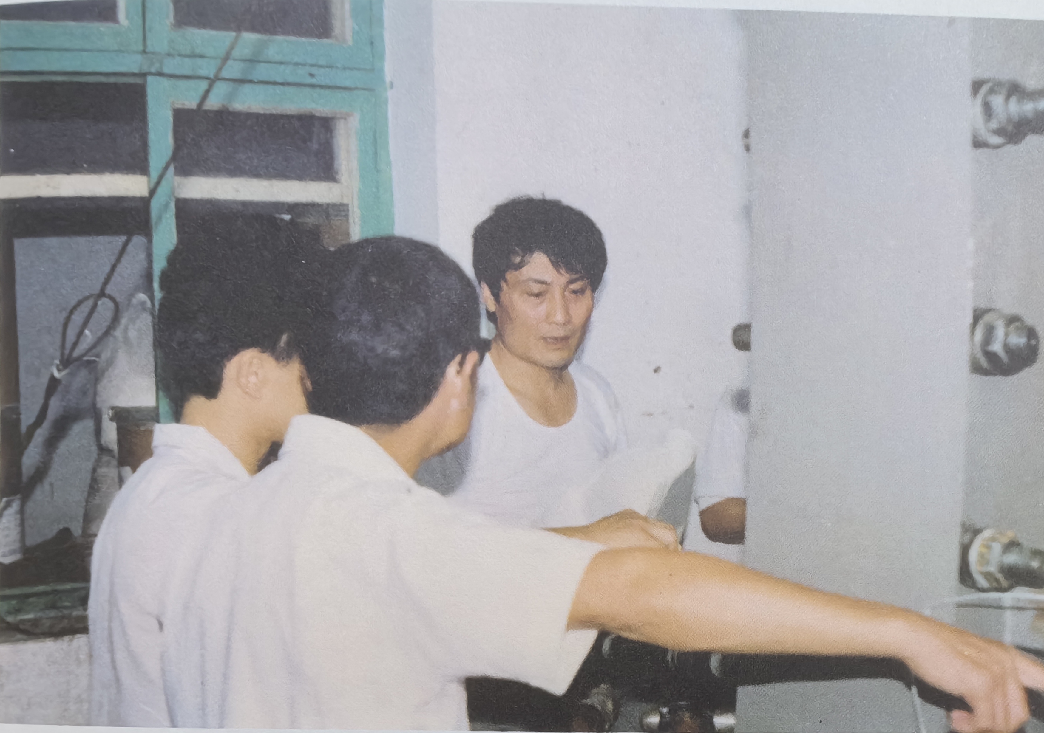 1989年,宗庆后在娃哈哈原液车间与工人们一起解决机器操作上的难题。