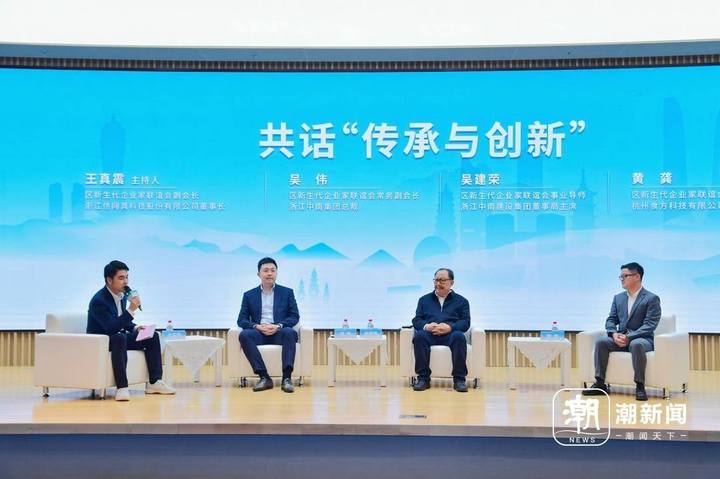 活动的高潮在一场“共话传承与创新”的圆桌论坛,中南集团董事局主席吴建荣,作为区新生代企业家联谊会事业导师走上舞台,与儿子——中南集团总裁吴伟,后辈——杭州食方科技有限公司董事长黄龚坐在一起,开展了一场“父与子”、“师与徒”的对话。