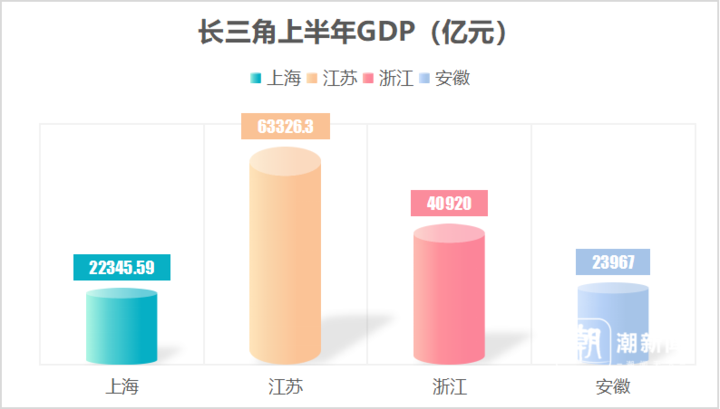 近日,长三角三省一市相继发布了上半年国民经济运行情况。今年上半年,长三角GDP总量突破了15万亿元;其中江苏以5.8%的增速领跑三省一市,浙江也首次在半年GDP中突破了4万亿元。