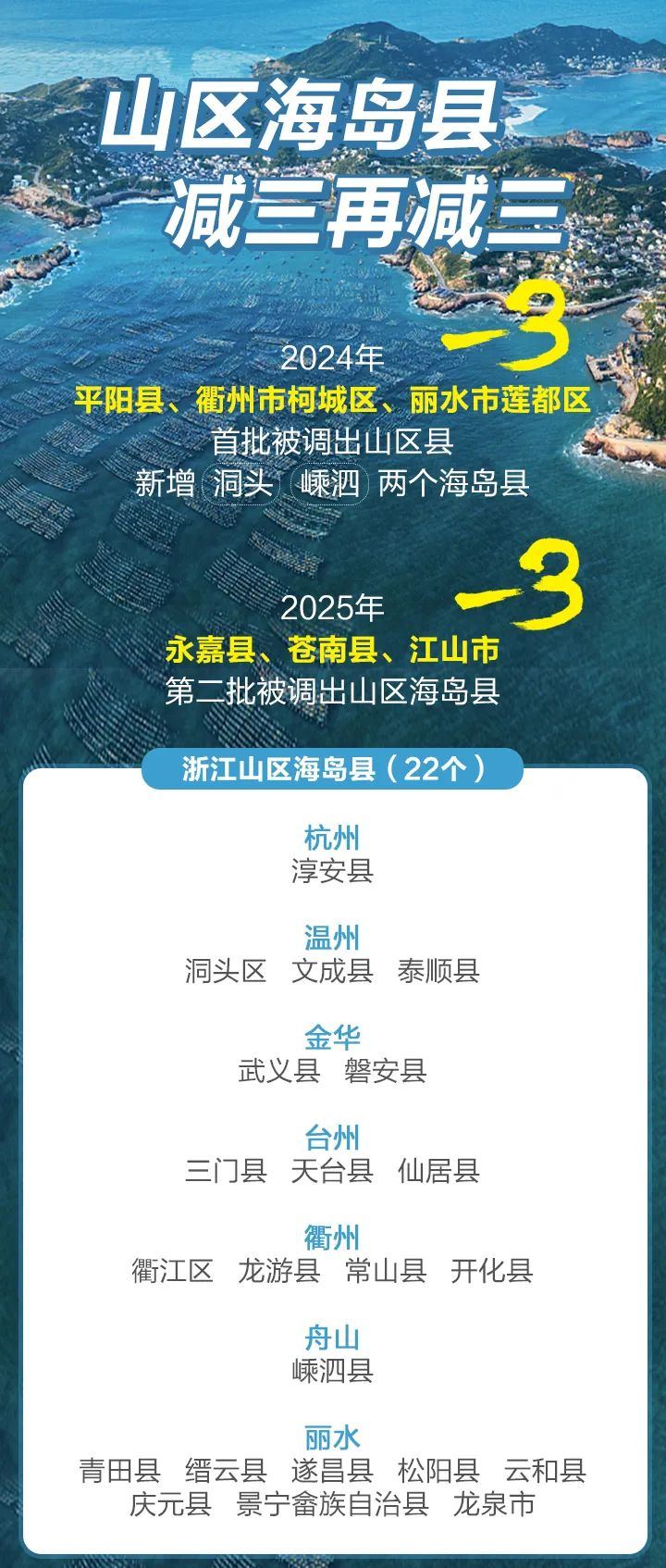 在浙江,山区海岛县是一群特殊的存在,身处这一队列,往往意味着由于地理位置偏远,其经济和社会发展水平还相对滞后,需要特殊政策扶持。而就在不久前召开的浙江山区海岛县高质量发展工作推进会上,这份名单有了新变化,永嘉县、苍南县和江山市,正式调出山区海岛县。