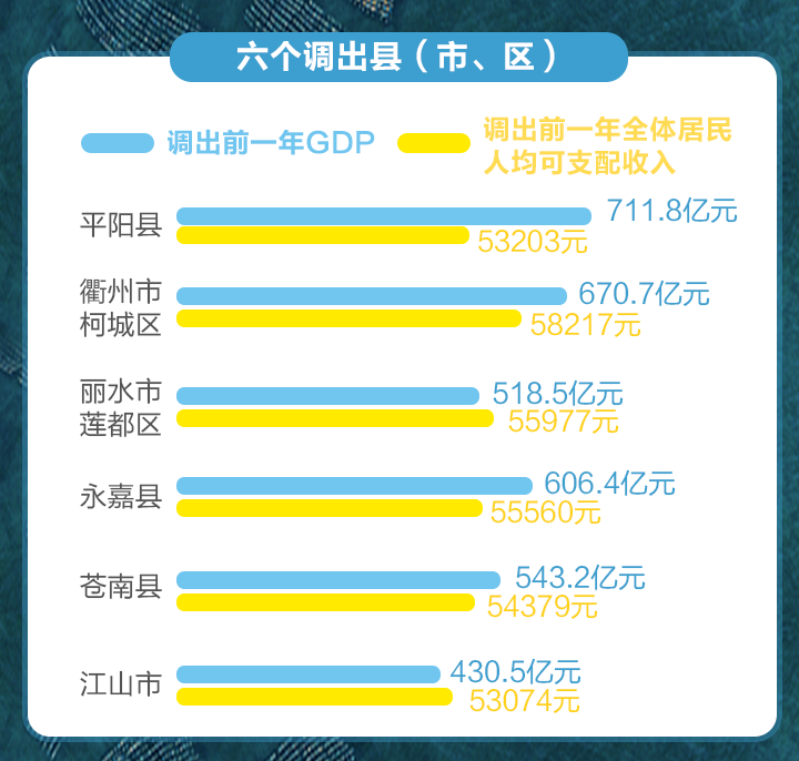 上述六个调出的县(市、区),除江山外,调出前一年的GDP均已超过500亿元。尤其平阳县,调出前一年的GDP已经超过了700亿元,放诸全省90个县(市、区),也是妥妥的中上游。同时,六个地方的全体居民人均可支配收入均已超过5万元。