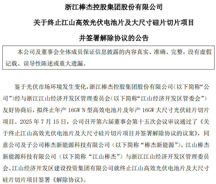 7月15日晚间,浙江上市公司棒杰股份(002634.SZ)发布重磅公告,宣布与江山经济开发区管委会签署《解除协议》,正式终止总投资80亿元的光伏电池片项目。这一决定标志着这家以无缝服装闻名的浙企,在经历两年跨界探索后重新聚焦主业。
