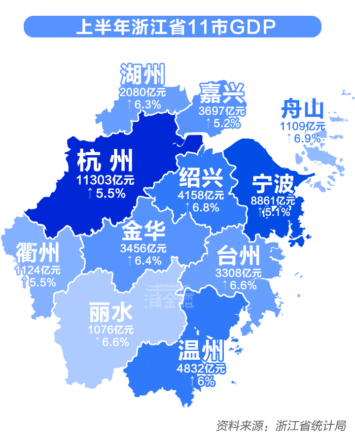 从增速看,上半年排名前三的分别是舟山、绍兴、台州和丽水(并列第三)。增速最快的舟山,为6.9%,紧随其后的绍兴6.8%,台州和丽水均为6.6%,“排头兵”们呈你追我赶、齐头并进的态势。