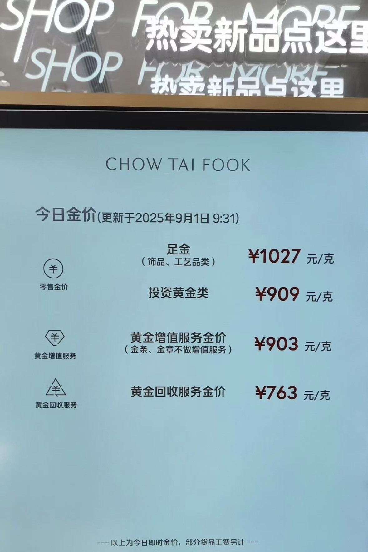 目前,国内多家品牌金店黄金零售价格维持高位,周大福、曼卡龙等均在1027元/克。