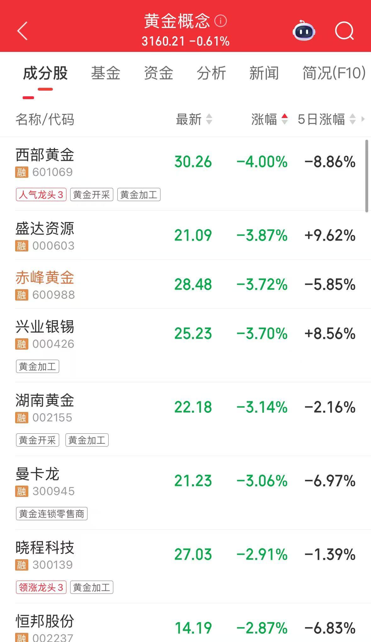 黄金概念股调整。截至发稿,西部黄金跌4%,赤峰黄金、湖南黄金、晓程科技等跌幅居前。