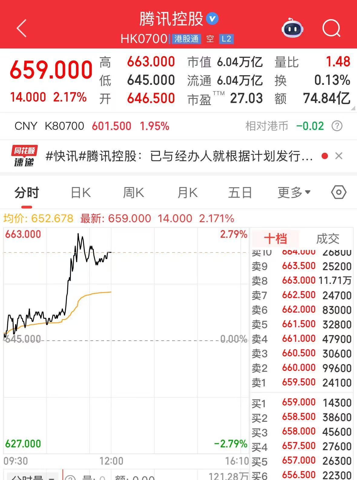腾讯控股涨超2%,总市值重回6万亿港元,股价现报659港元逼近历史高点,年内涨超58%。