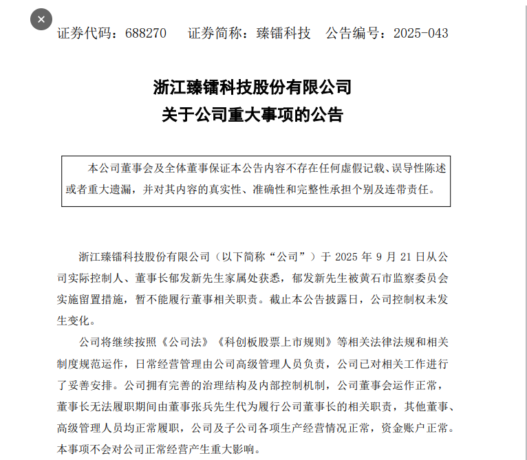 今天一早,浙江A股上市公司浙江臻镭科技股份有限公司(简称“臻镭科技”)发布重大事项公告,公司于9月21日从公司实际控制人、董事长郁发新先生家属处获悉,郁发新先生被黄石市监察委员会实施留置措施,暂不能履行董事相关职责。截至本公告披露日,公司控制权未发生变化。