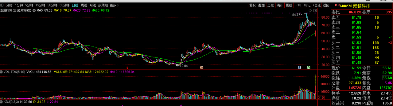今天开盘后,臻镭科技股价一度跌停,跌幅20%,市值缩水近30亿元。截至上午收盘,跌幅收窄至12.59%。
