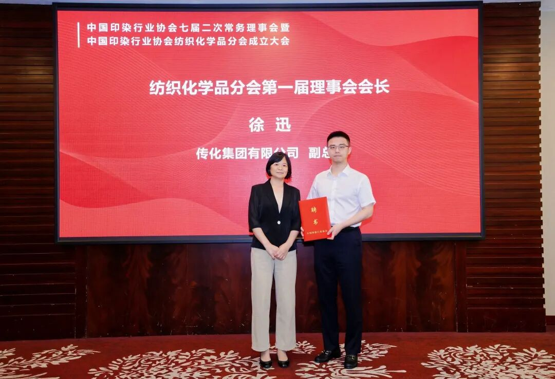 此次会议在广东佛山市三水区举行。中国印染行业协会会长林琳为徐迅颁发聘书。