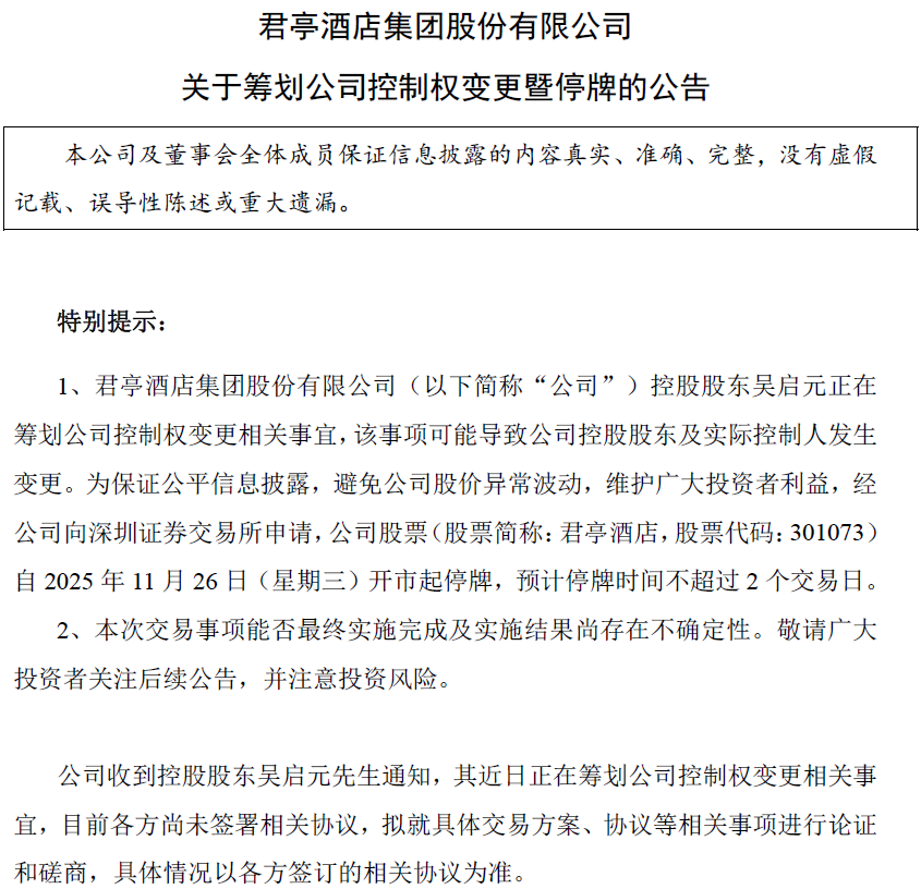 11月25日晚间,中高端酒店品牌运营商君亭酒店集团股份有限公司(证券代码:301073,简称:君亭酒店)发布公告称,公司控股股东吴启元正在筹划公司控制权变更的相关事宜,该事项可能导致公司控股股东及实际控制人发生变更。公司股票自2025年11月26日开市起停牌,预计停牌时间不超过2个交易日。