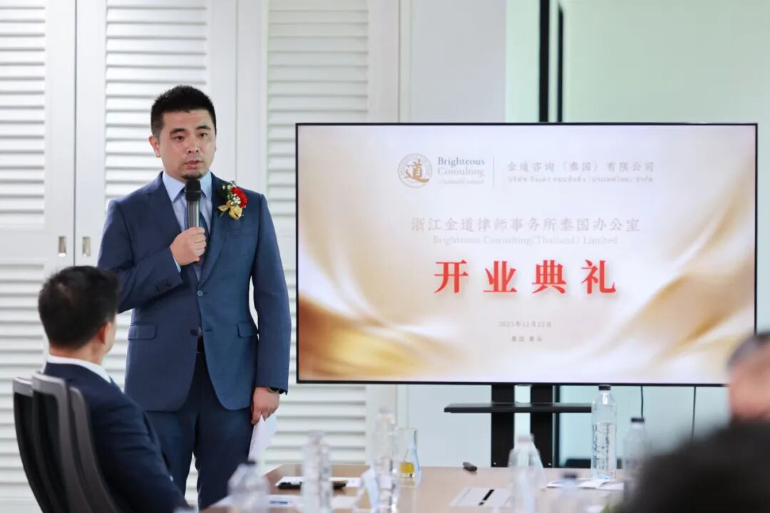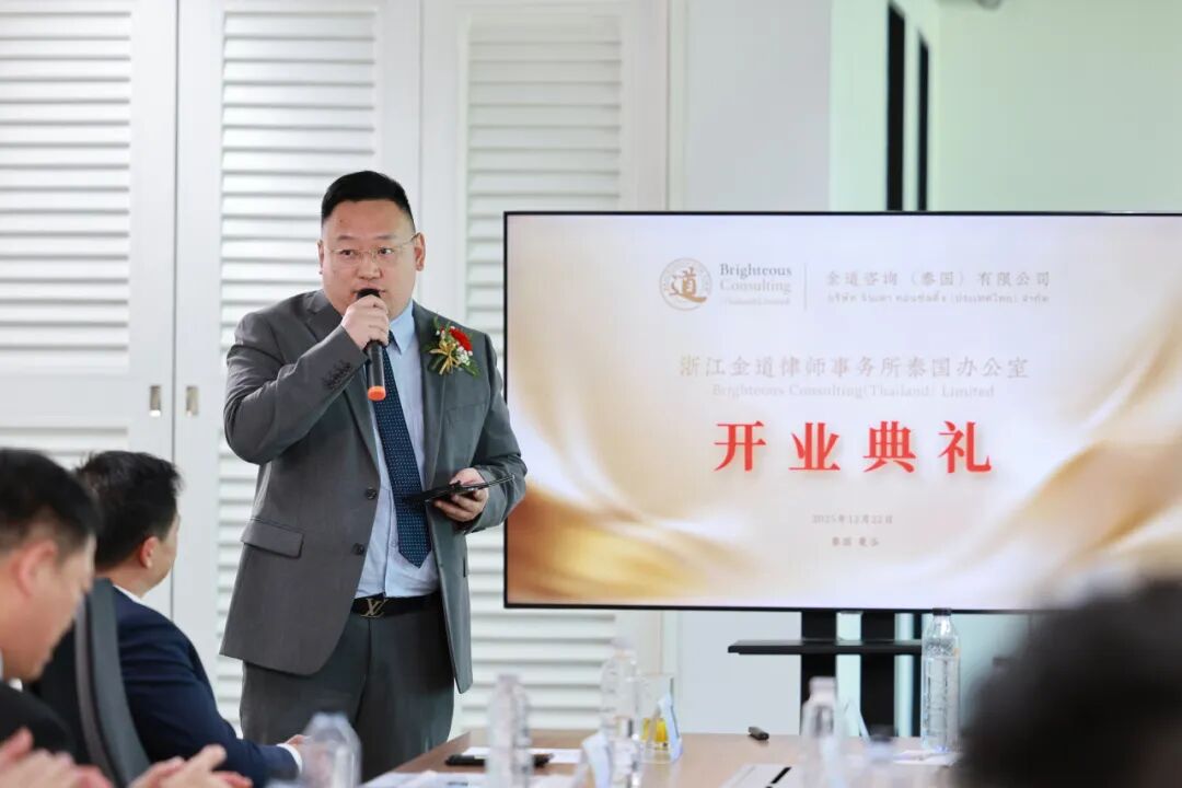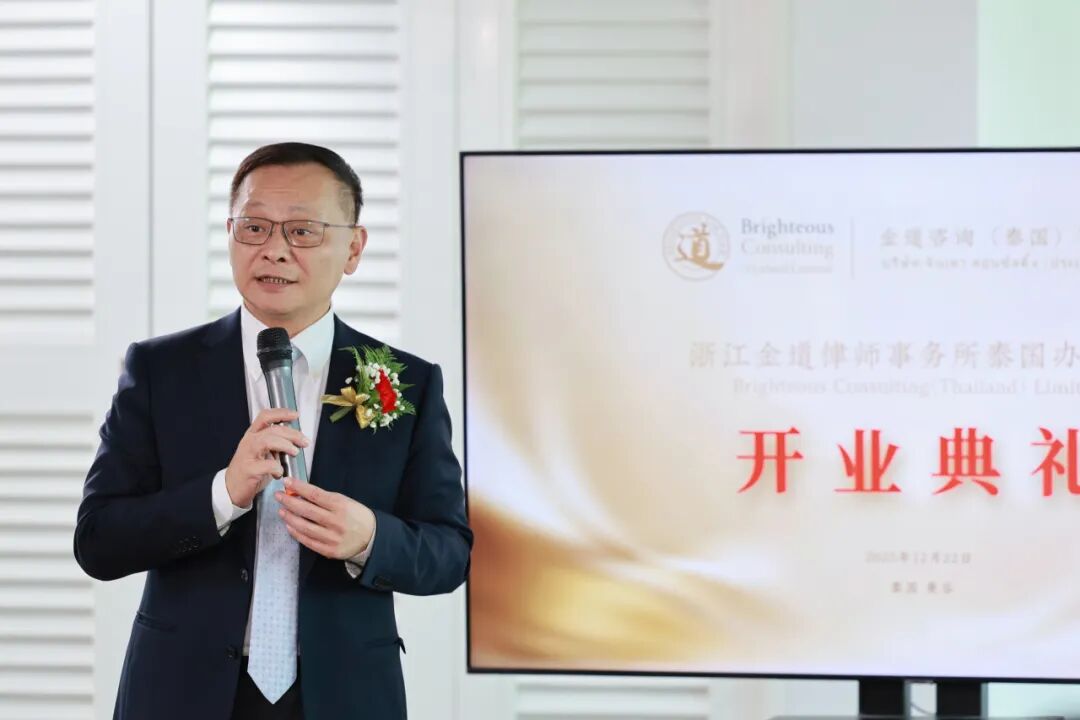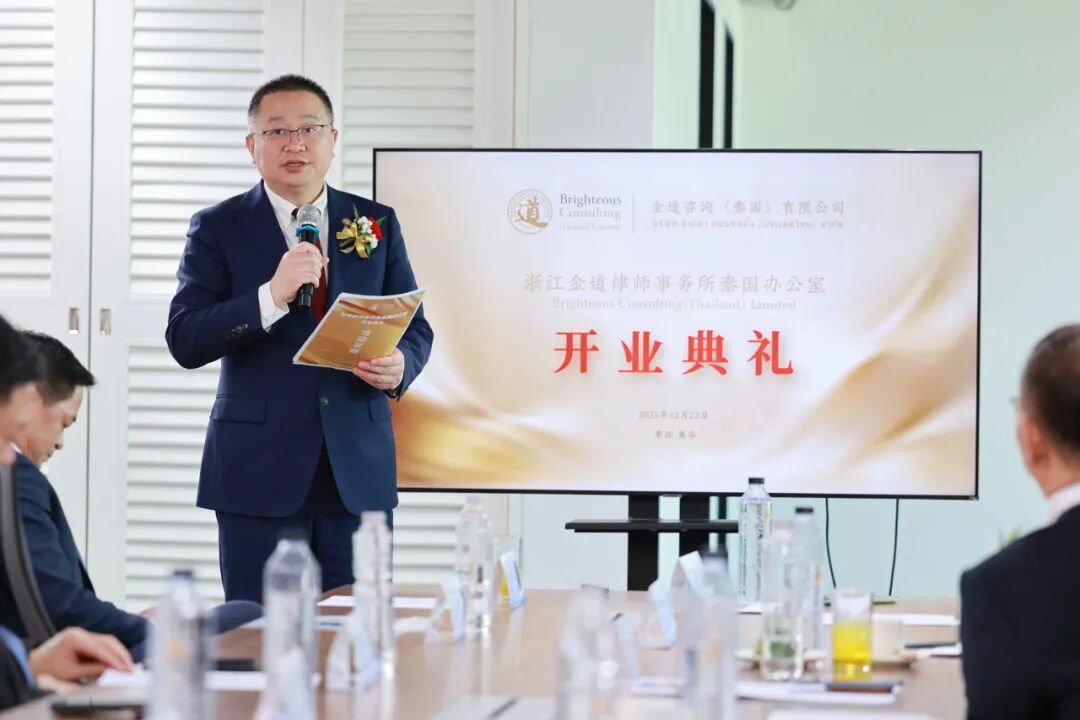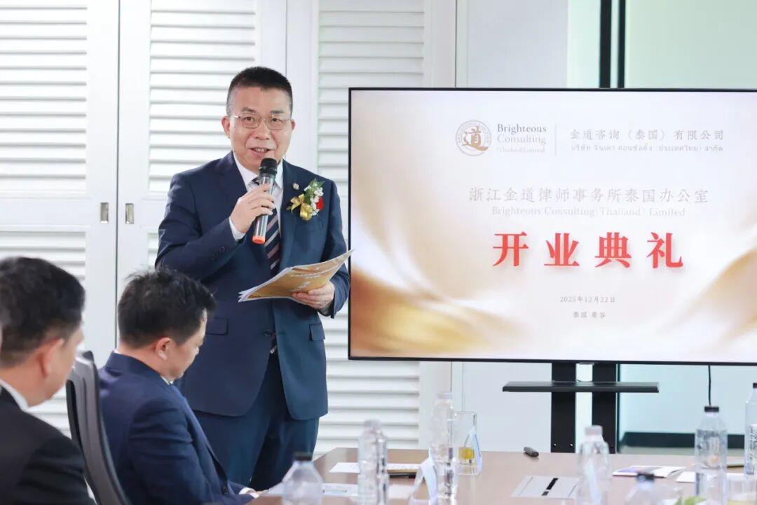 金道所主任、合伙人会议主席王全明致辞,他表示,在中泰建交50周年的重要时刻,金道所首家海外办公室落户泰国,恰逢其盛、意义深远,不仅是金道国际化进程的关键里程碑,也是中泰经贸合作持续深化的生动写照。他指出,中国是泰国长期最大贸易伙伴,浙江与泰国经贸往来日益紧密;金道所选择泰国设立首家海外办公室,正是为了搭建法律服务的双向桥梁,助力浙江企业“走出去”在泰投资,也支持泰国企业“引进来”在浙发展,为两地经贸繁荣提供专业支持。金道所成立于2006年,拥有500余名律师及20个专业委员会,在涉外法律服务等领域具备深厚积淀。未来,泰国办公室将依托金道全球网络与专业团队,以一流综合法律服务为中泰客户保驾护航,续写合作新篇章。