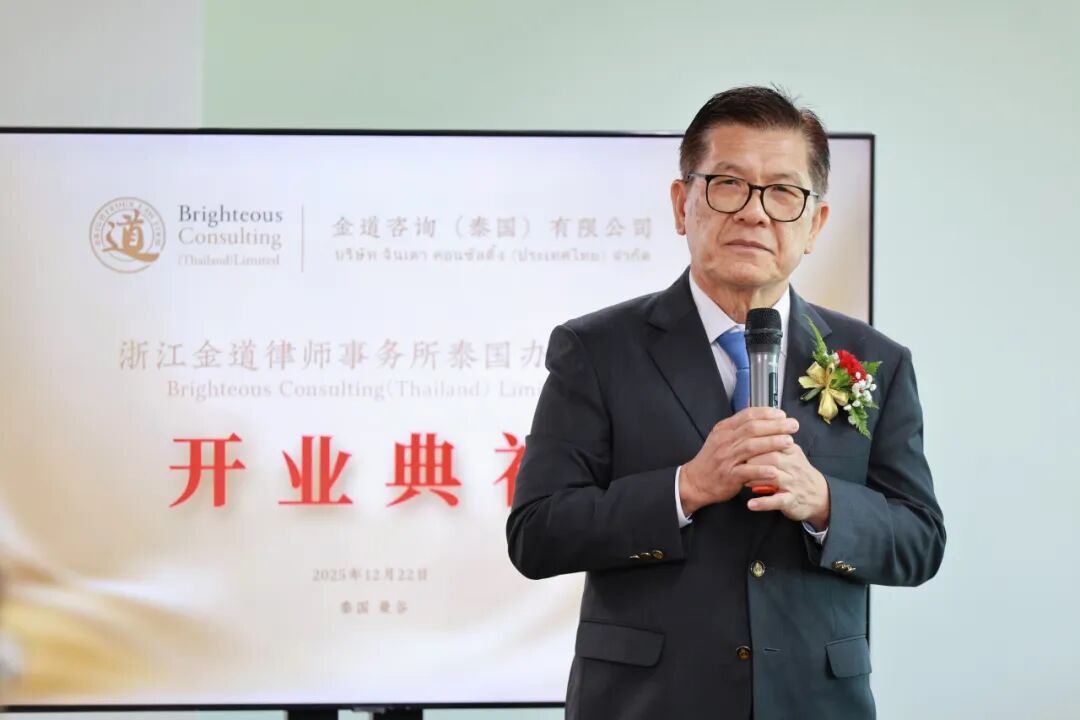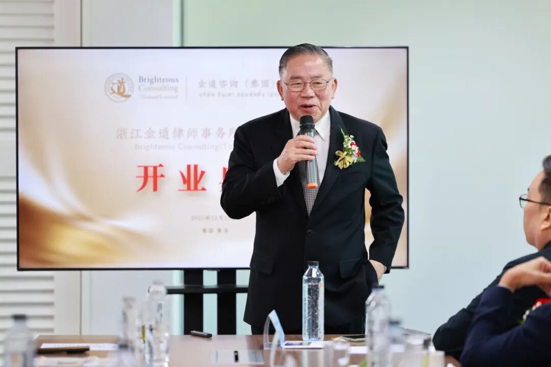 泰国最高法院前副院长八国大法官(Mr. Prakob Leenapaesanant)致辞,他在分享中表示金道所在中国享有声誉,希望金道泰国办公室也能在泰国生根发芽、熠熠生辉。作为曾在泰国从事司法审判的法官,他结合自身司法实践经历指出,每一位世界公民的生存与发展,都应当受到法律的充分保护。他希望金道泰国办公室的设立,能够为中泰两国公民提供专业的法律服务支持。最后,他寄望金道所能够凭借其高水平的律师团队与高质量的服务,为中泰主体提供有力的法律保障,贡献金道的专业智慧与力量。