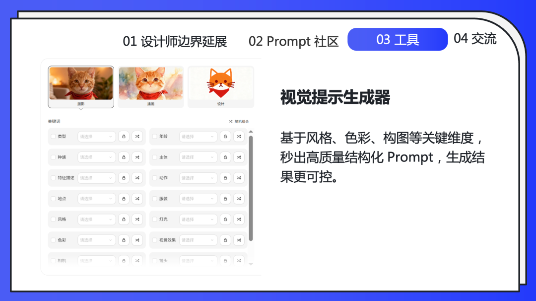 在胡松老师的分享中,他指出了专业社区对设计师的价值与意义。在AI快速发展的今天,设计师如何利用AI辅助创作,形成AI+设计师的创作新常态。同时基于不同设计师的独特思路,带来AI 创作表达的差异化和独特性。