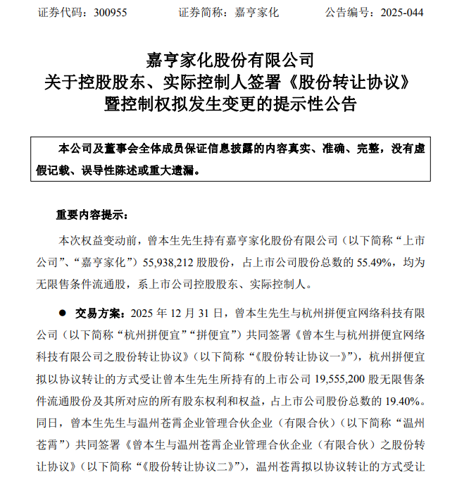 近日,嘉亨家化(300955.SZ)发布公告称,公司控股股东、实际控制人曾本生分别与杭州拼便宜、温州苍霄、杭州润宜签署股份转让协议,以每股33.21元的价格合计转让其所持有的29937600股公司股份(占上市公司股份总数的29.70%)。曾本生还将放弃其所持有的剩余26000612股股份(占上市公司股份总数的25.79%)的表决权。