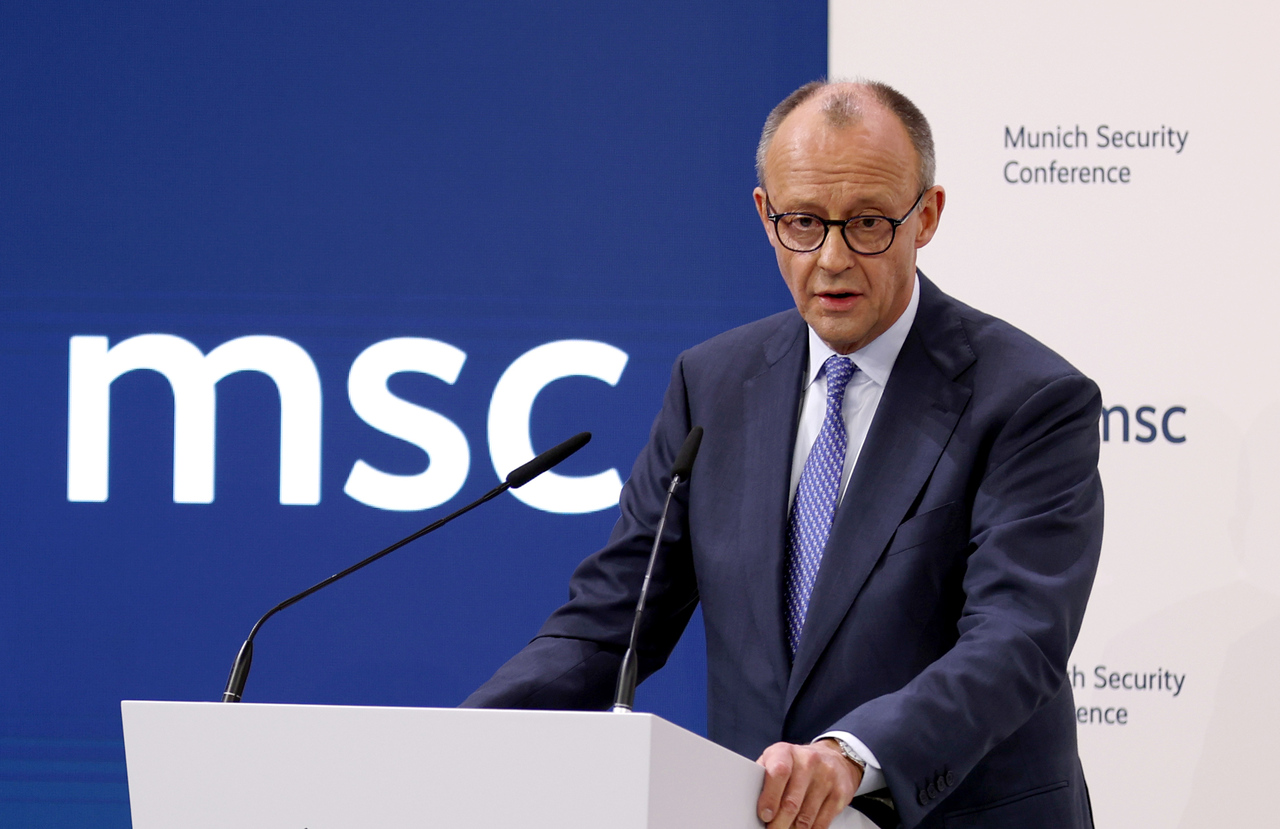 2月13日,德国慕尼黑,默茨在慕尼黑安全会议开幕式上致辞。新华社记者 李颖 摄