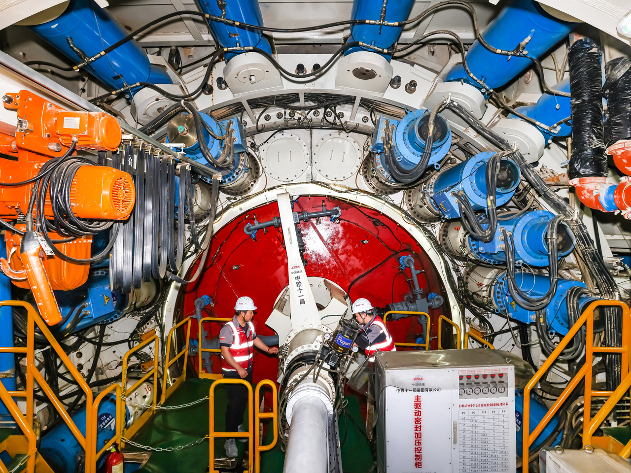 中铁十一局工作人员在调试甬舟铁路金塘海底隧道“定海号”盾构机主驱动。张玺 摄