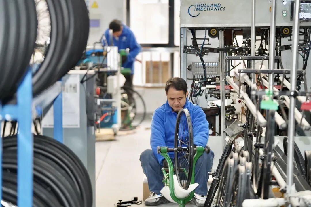 车间里,组装环形吊线高速运转,工人们各司其职、忙而有序。装货区,一辆辆载满桐乡造自行车的货车缓缓开出厂区,奔赴全球市场。