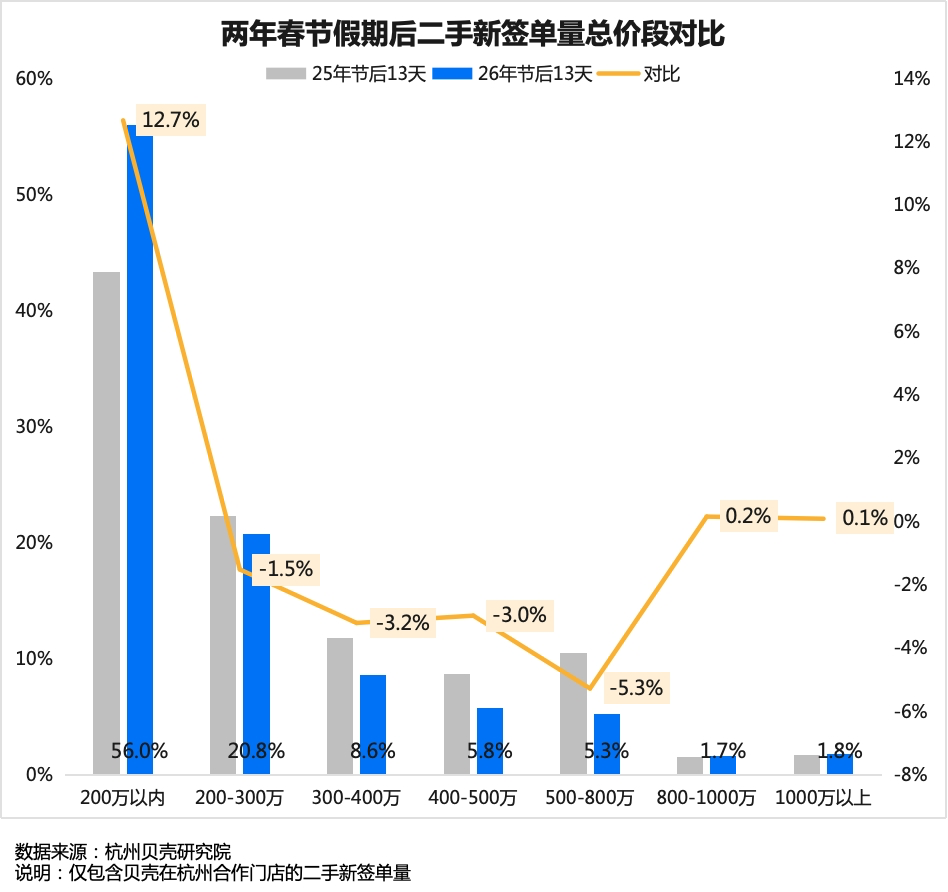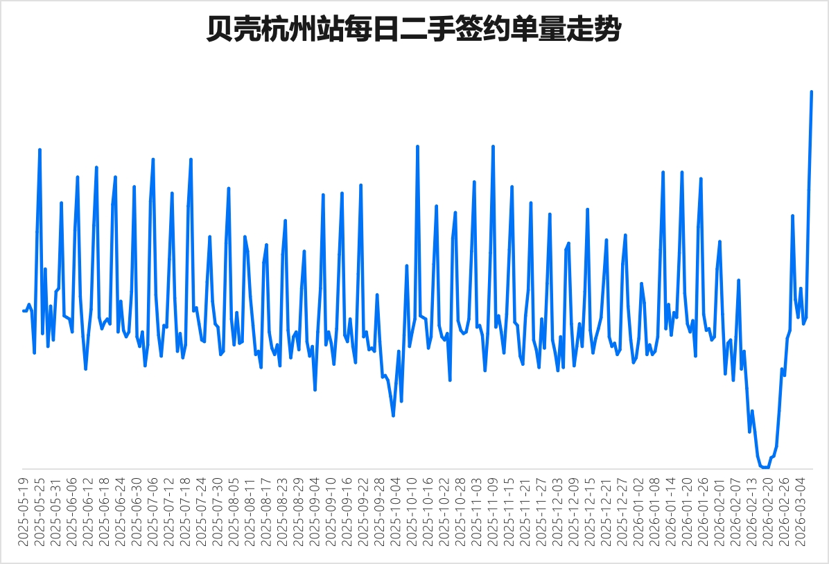 根据杭州贝壳研究院的数据,春节后杭州二手房成交量明显回升。上周日(3月8日),仅贝壳合作门店二手房新签单量就有234单,是自2025年5月19日以来的最高值,与去年的3月下旬相当。上个周末两天的日均带看量,相比节后第一个周末,增长36%。