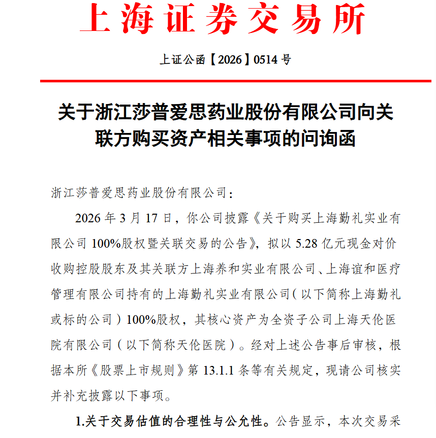 然而,市场热情难掩交易争议。就在公告发布当日,上交所便“火速”向莎普爱思下发问询函,要求公司说明估值合理性、是否存在利益输送等核心问题。