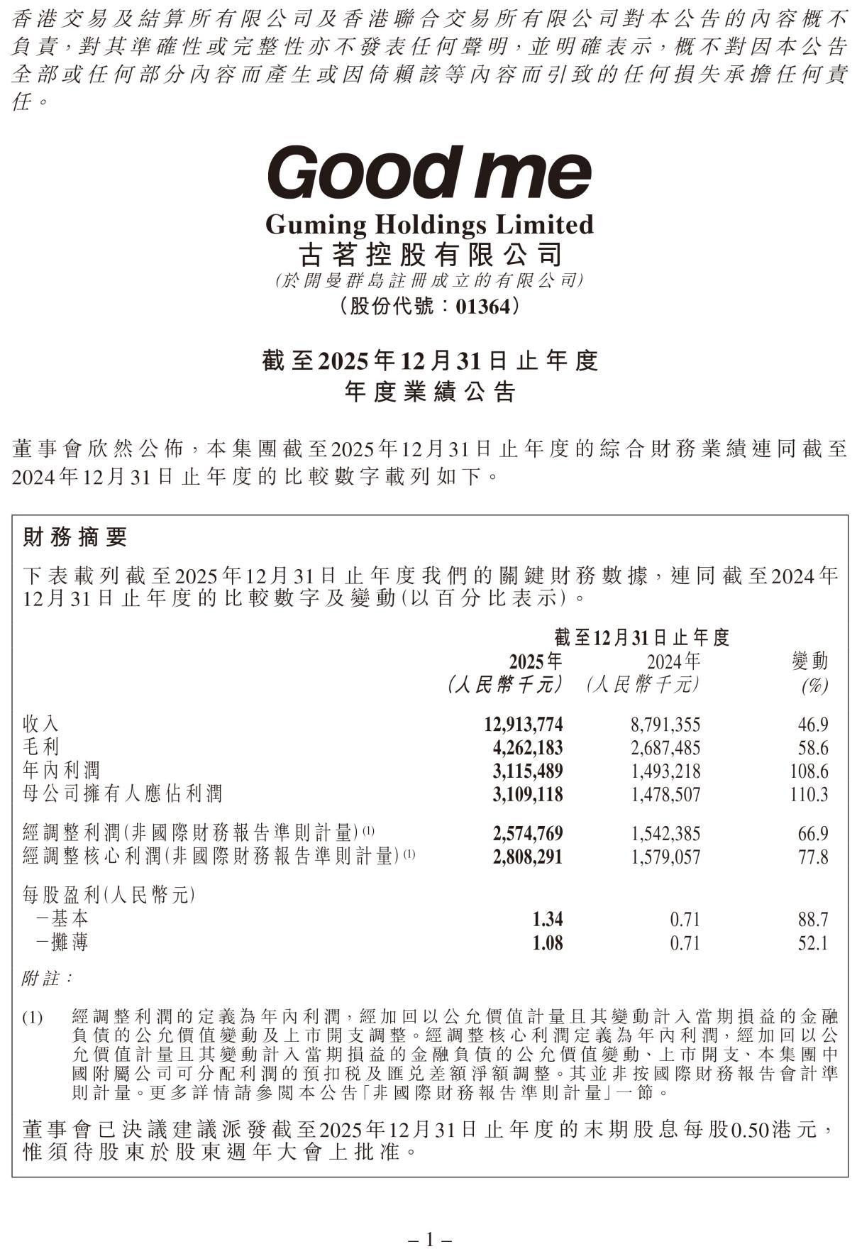 在现制茶饮赛道竞争日趋胶着的当下,头部品牌正以强劲的增长态势持续加码。3月25日,浙江新茶饮品牌古茗发布2025年度业绩报告,交出了一份收入、利润双双大幅增长的亮眼成绩单:全年总收入约129亿元,同比增长46.9%;经调整利润(非国际财务报告准则计量)约25.75亿元,同比增幅达66.9%。门店总数也一举突破1.3万家,净增3640家。