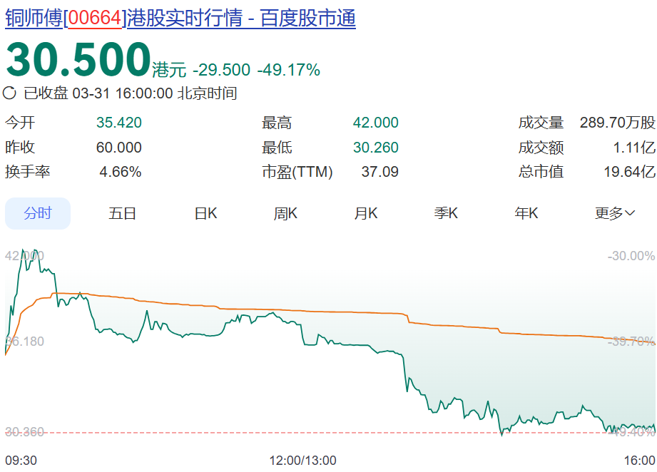3月31日港股大盘整体走势分化,恒生指数微涨0.15%,恒生科技指数微跌 0.86%,新消费赛道情绪偏谨慎。铜师傅开盘报35.42港元,较60港元发行价跌超40%,盘中最高触及42港元,最低下探30.26港元,跌幅一度逼近49.57%,最终收报30.5港元,全日大跌49.17%,总市值定格19.64亿港元,相较发行市值近乎腰斩,成为当日港股新股里的“显眼包”。