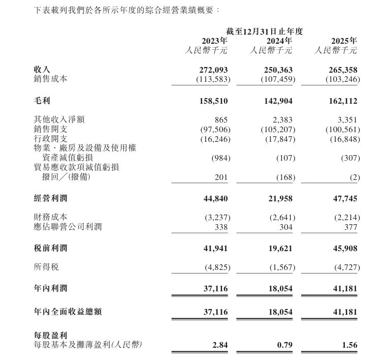 值得注意的是,报告期内来自销售处方眼镜的收入分别占毛源昌眼镜收入的约79.7%、80.1%、79.6%,收入高度集中于单一品类。自营门店贡献约74%的收入,加盟业务占比约25%,而线上渠道占比已从2023年的1.5%持续收缩至2025年的不足1%。收入结构高度依赖线下门店体系,线上零售的迅速增长或将对公司的业务模式及经营业绩带来挑战。