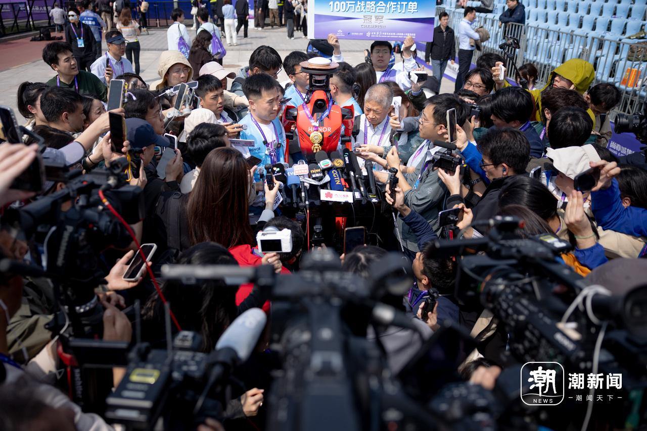 夺冠后的荣耀自研人形机器人“闪电”备受中外媒体瞩目。潮新闻记者 倪雁强 摄