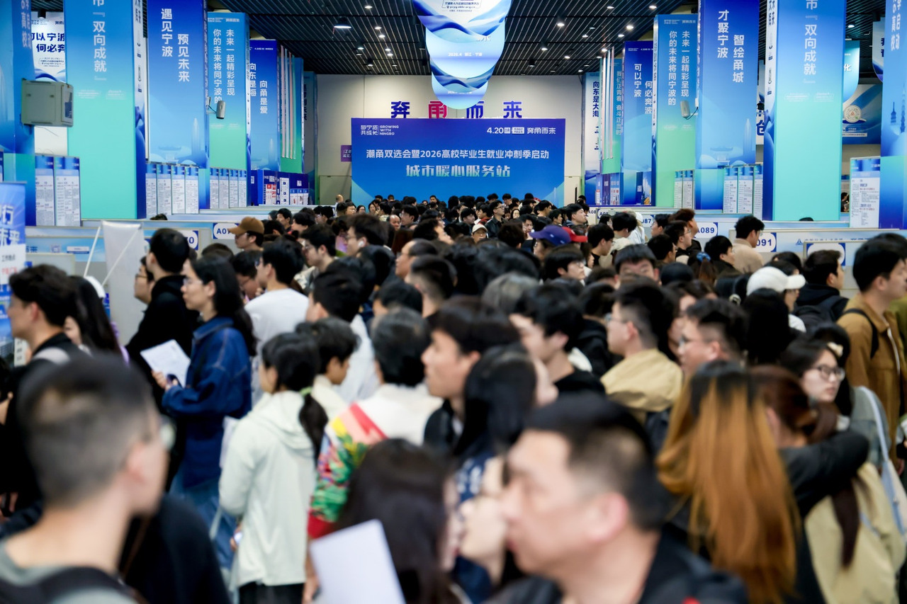 19日,潮“甬”双选会暨高校毕业生就业冲刺季招聘会现场人头攒动,这是宁波首场以人工智能为主题的市级招聘会。168家企事业单位推出招聘岗位583个,需求各类人才2529人,岗位平均年薪超16万元,其中AI相关岗位占比达43%,吸引全国3700余名高校学子参会对接。