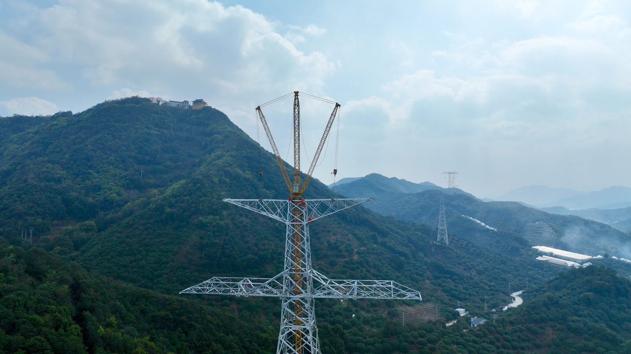 工程正在进行铁塔组立 图源:国网浙江电力
