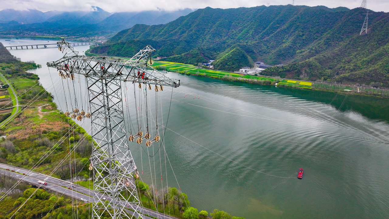 挑战是极为具象的:江面常年有风。百米高空的风,比地面凶得多。施工队要同时对付风和导线自重下垂——让几吨重的导线,以厘米级精度穿过1500米外的滑车。要知道,任何细微的张力波动,在1.5公里的距离上都会被成倍放大,极易导致导线鞭舞甚至跳槽。同时,富春江作为黄金航道,日均船舶流量极大,长期封航并不现实。